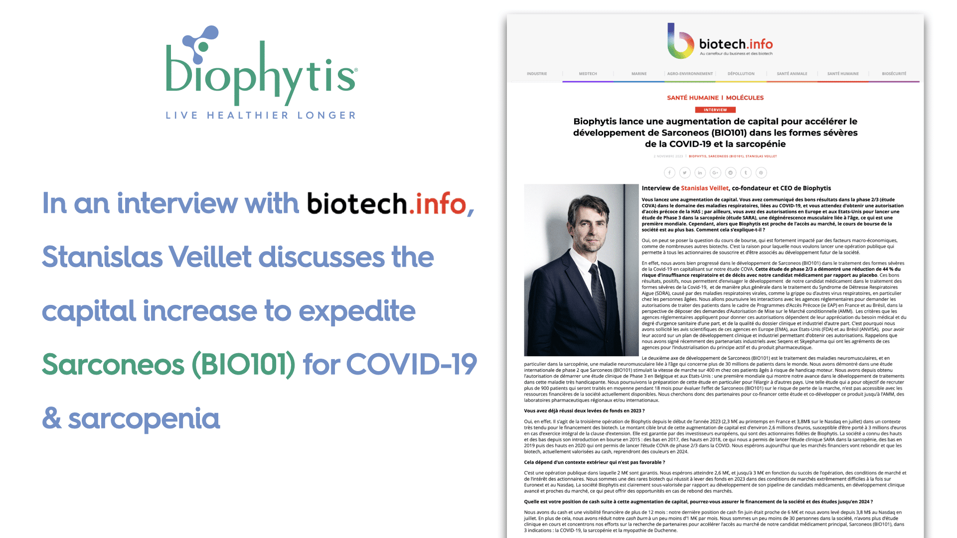 In an exclusive interview with Biotech Info (in French), Stanislas Veillet, CEO & co-founder of Biophytis, unveils the capital increase for Sarconeos (BIO101) targeting severe COVID-19 & sarcopenia.